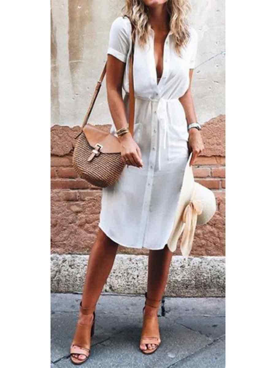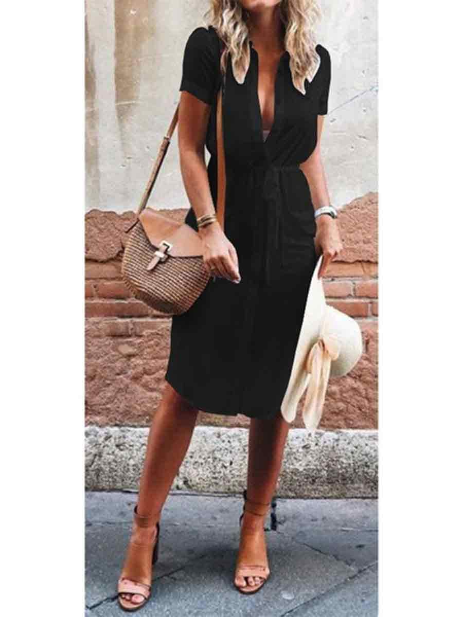 Elegant Solid Color Turn-down Collar Shirt Dress