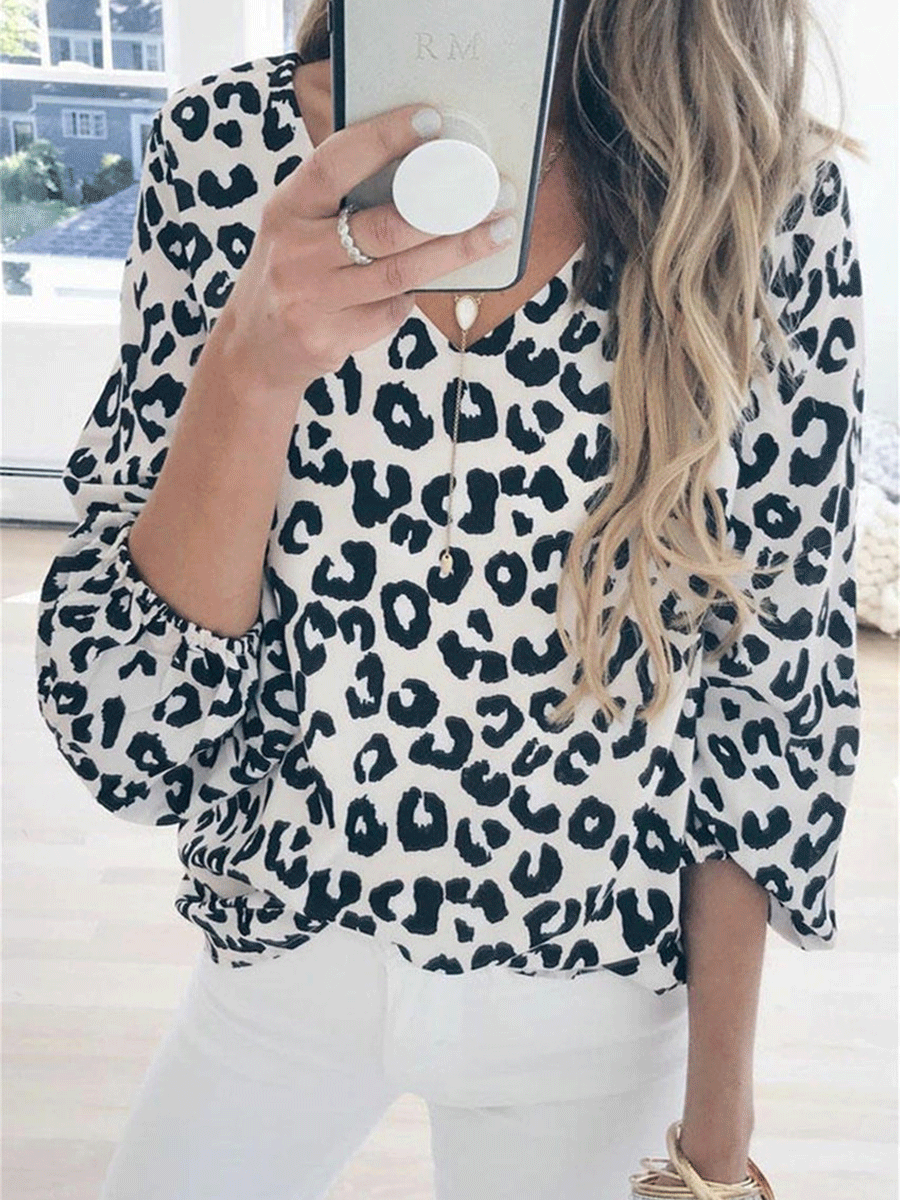 Leopard V-neck Lantern Sleeve Casual T-shirt