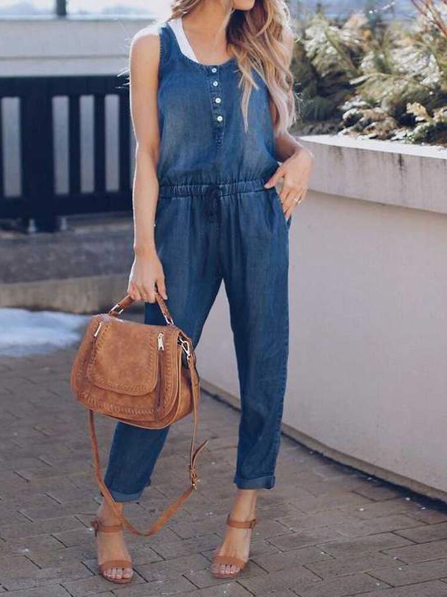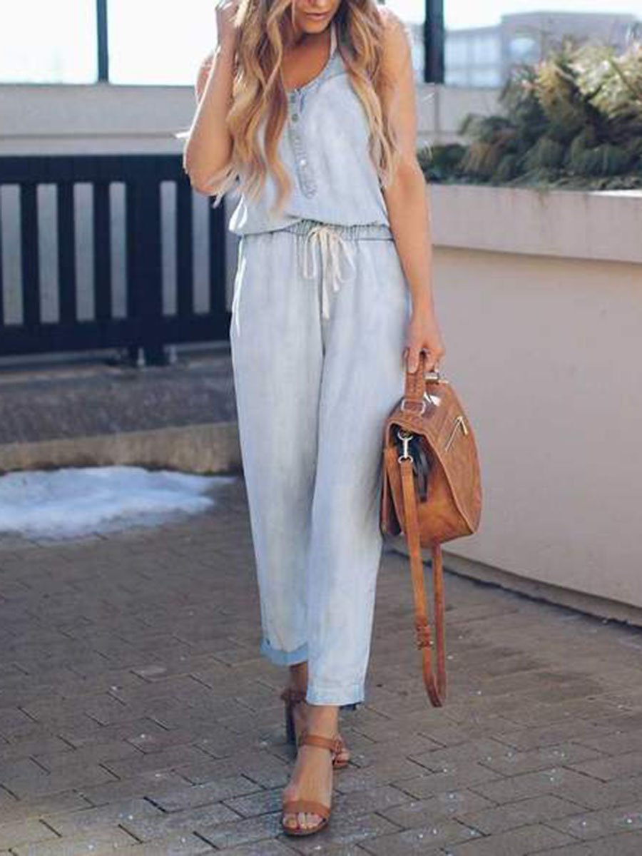 Buttons Neck Elastic Drawstring Waist Denim Jumpsuits