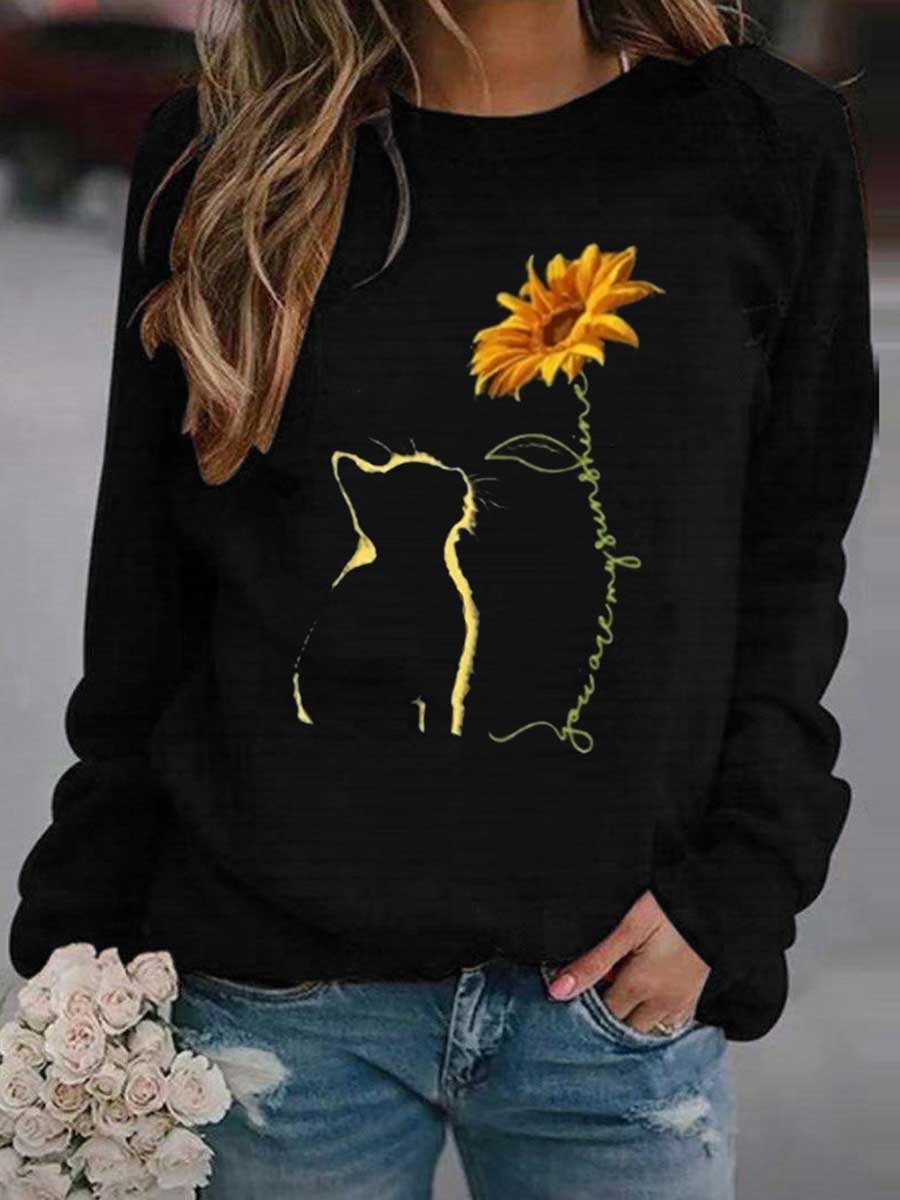 Sunflower and Cat Printed Sweatshirt