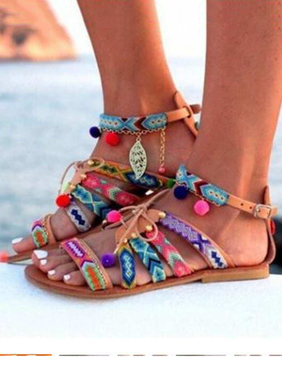 Pom Pom Lace-up Casual Ethnic Flat Sandals