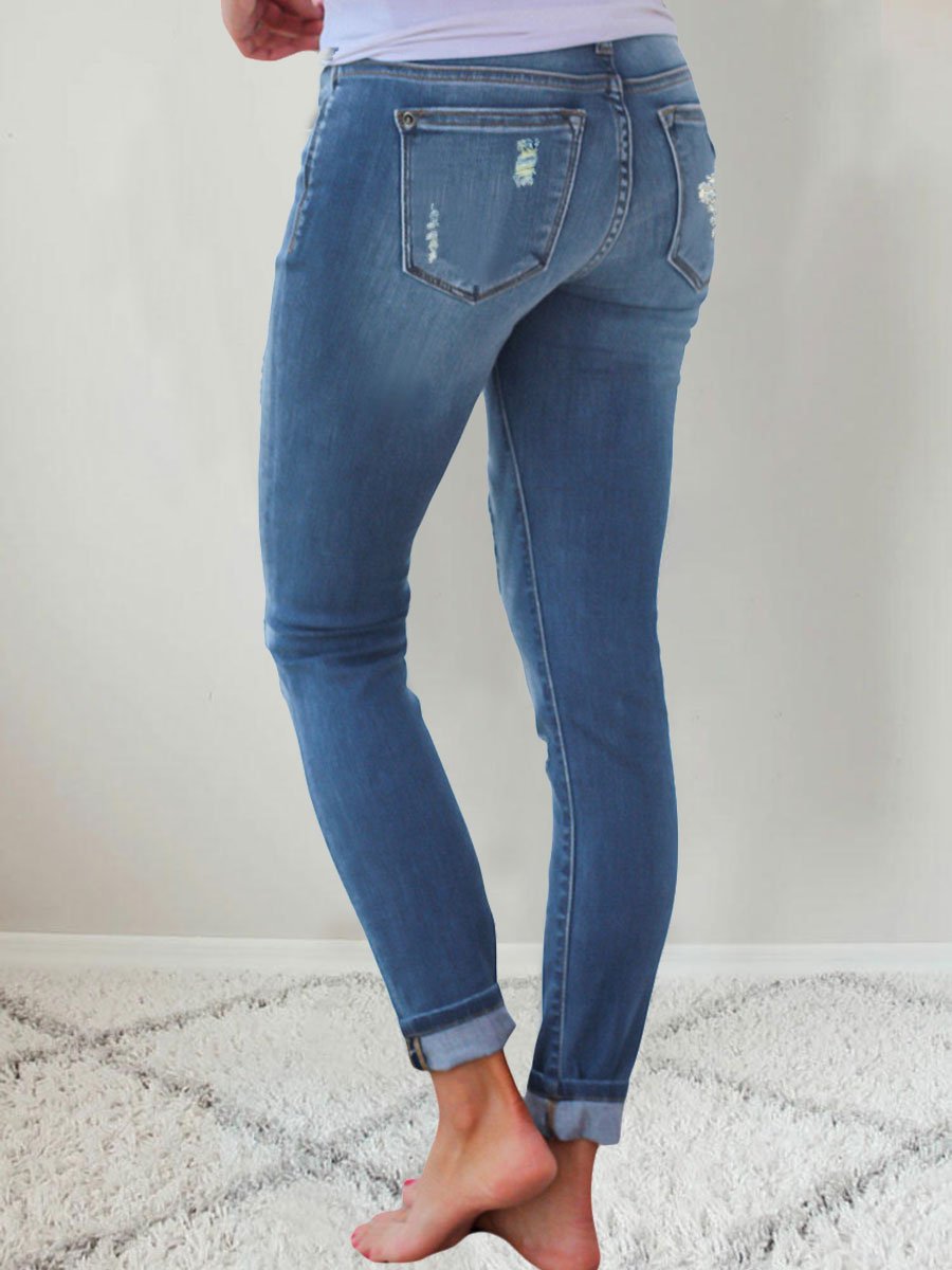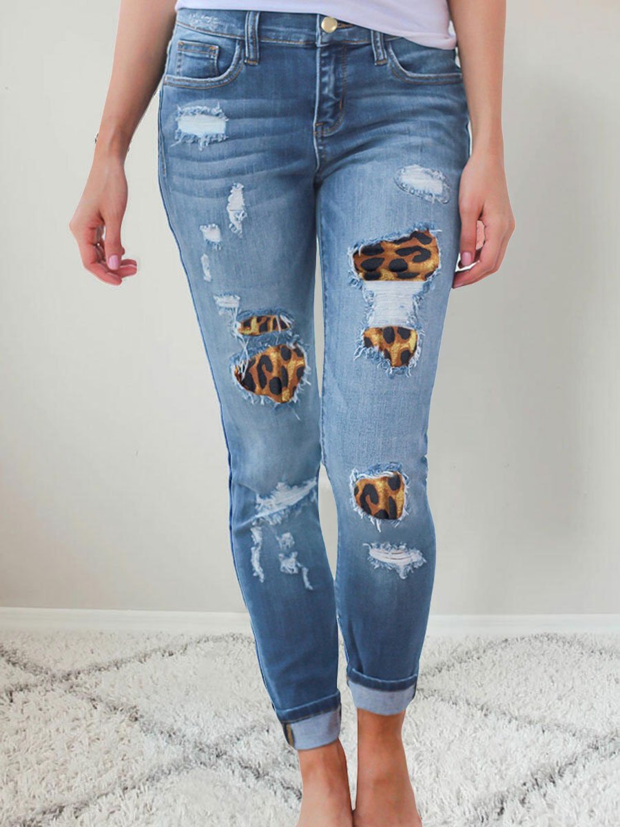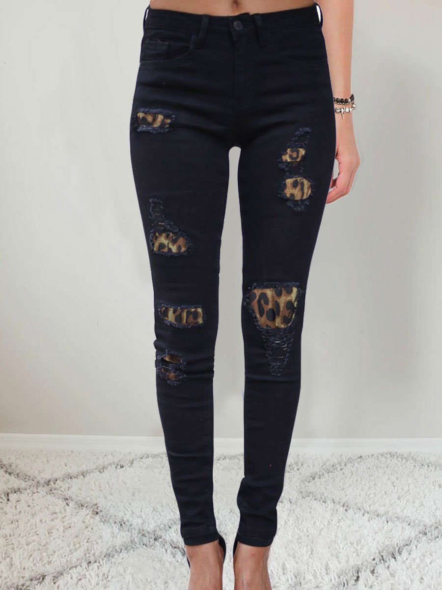 Ripped Leopard Patch Pocket High Waist Skinny Jeans