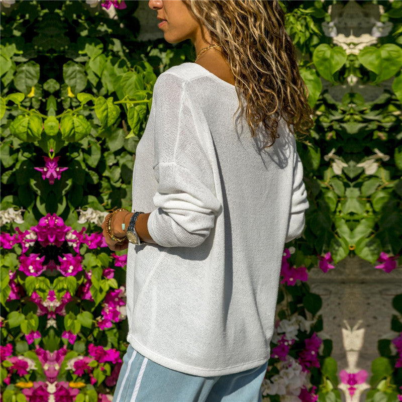 Solid Color V-neck Long Sleeve T-shirt