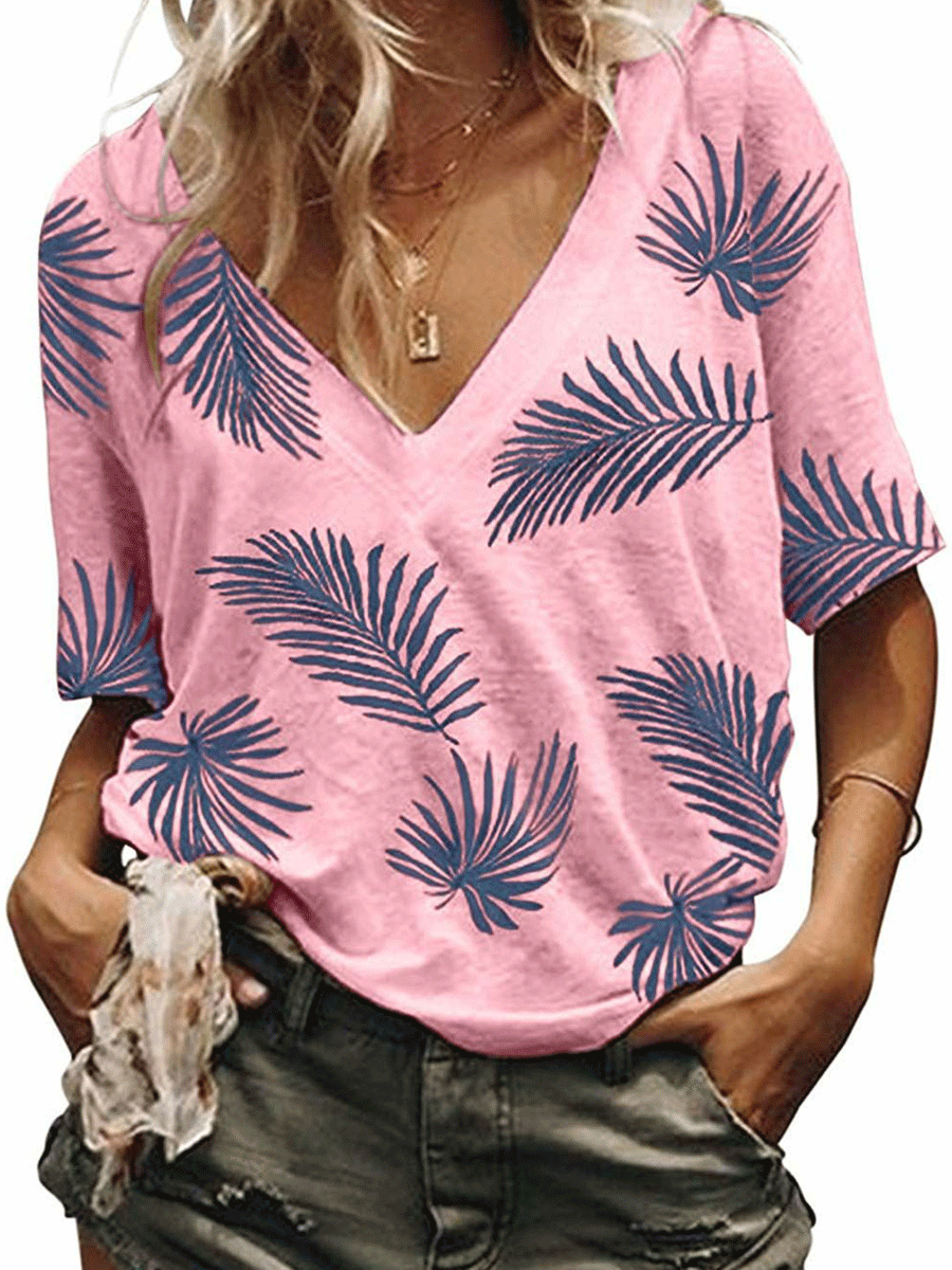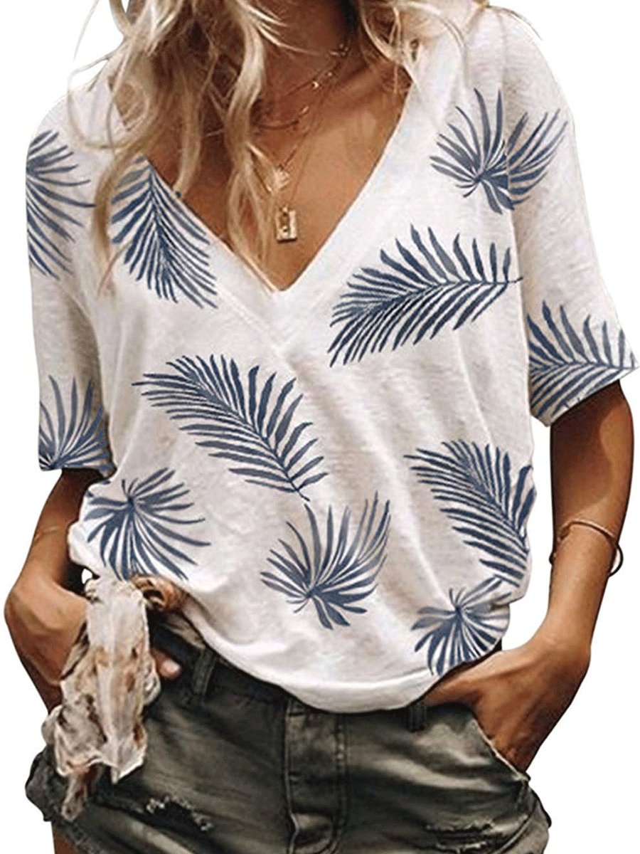 V-neck Loose Short Sleeve Leaf Print T-shirt