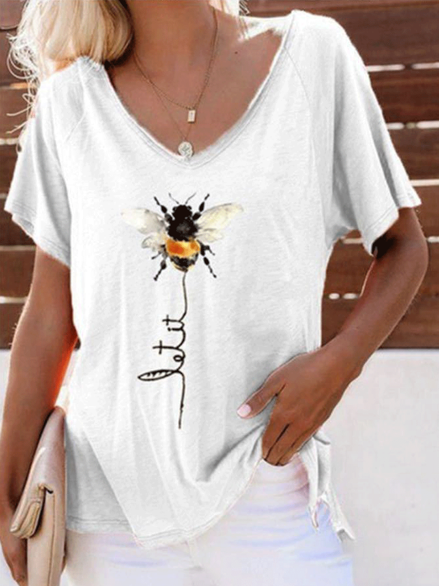 V-neck Short Sleeve Loose Bee Print T-shirt