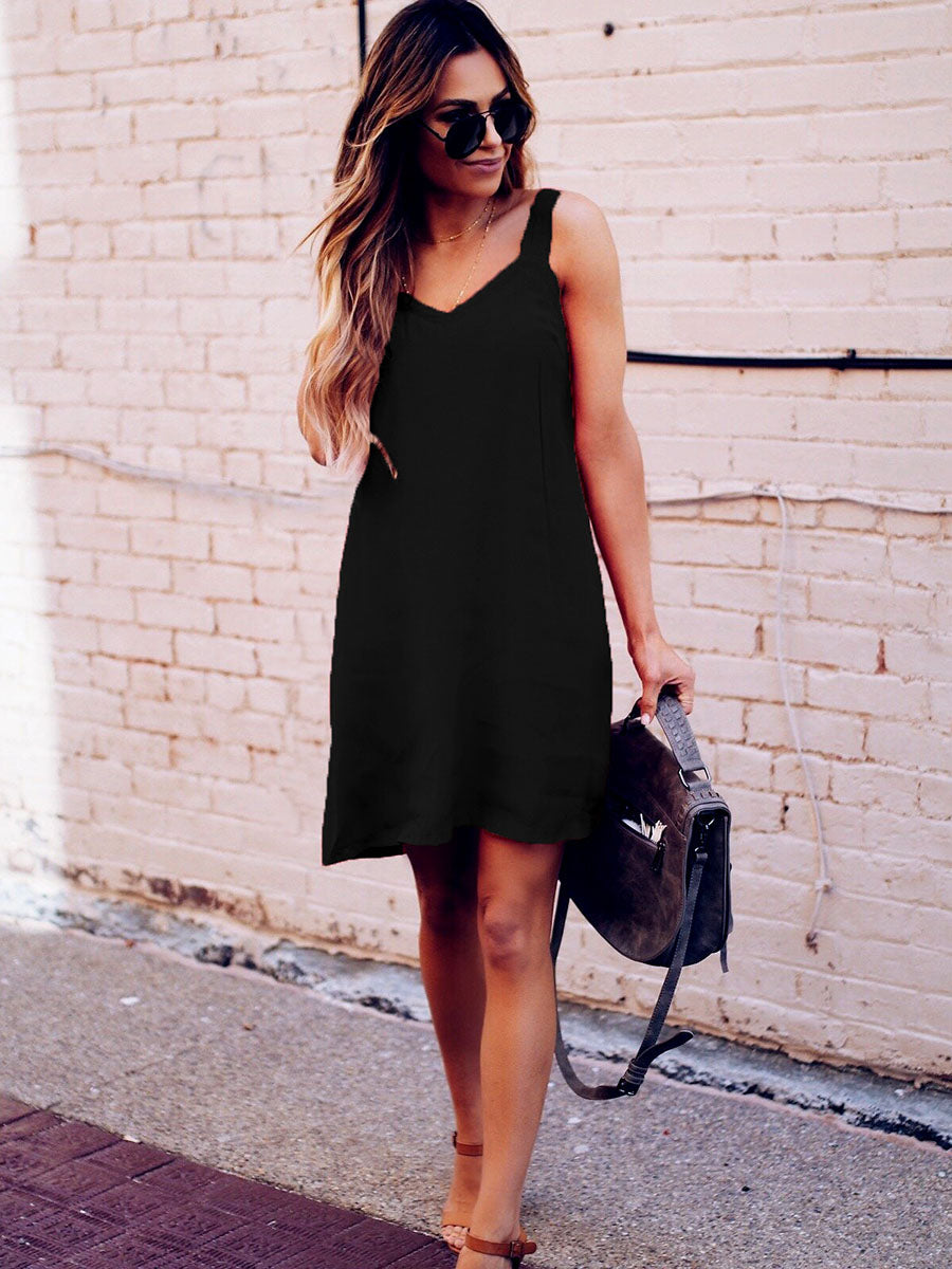 V-Neck Straps Solid Color Dress