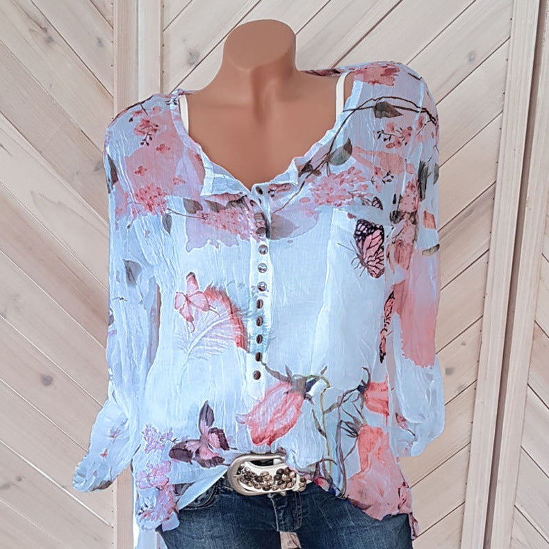 V-neck button long sleeve printed chiffon top