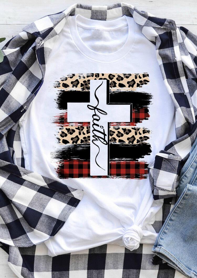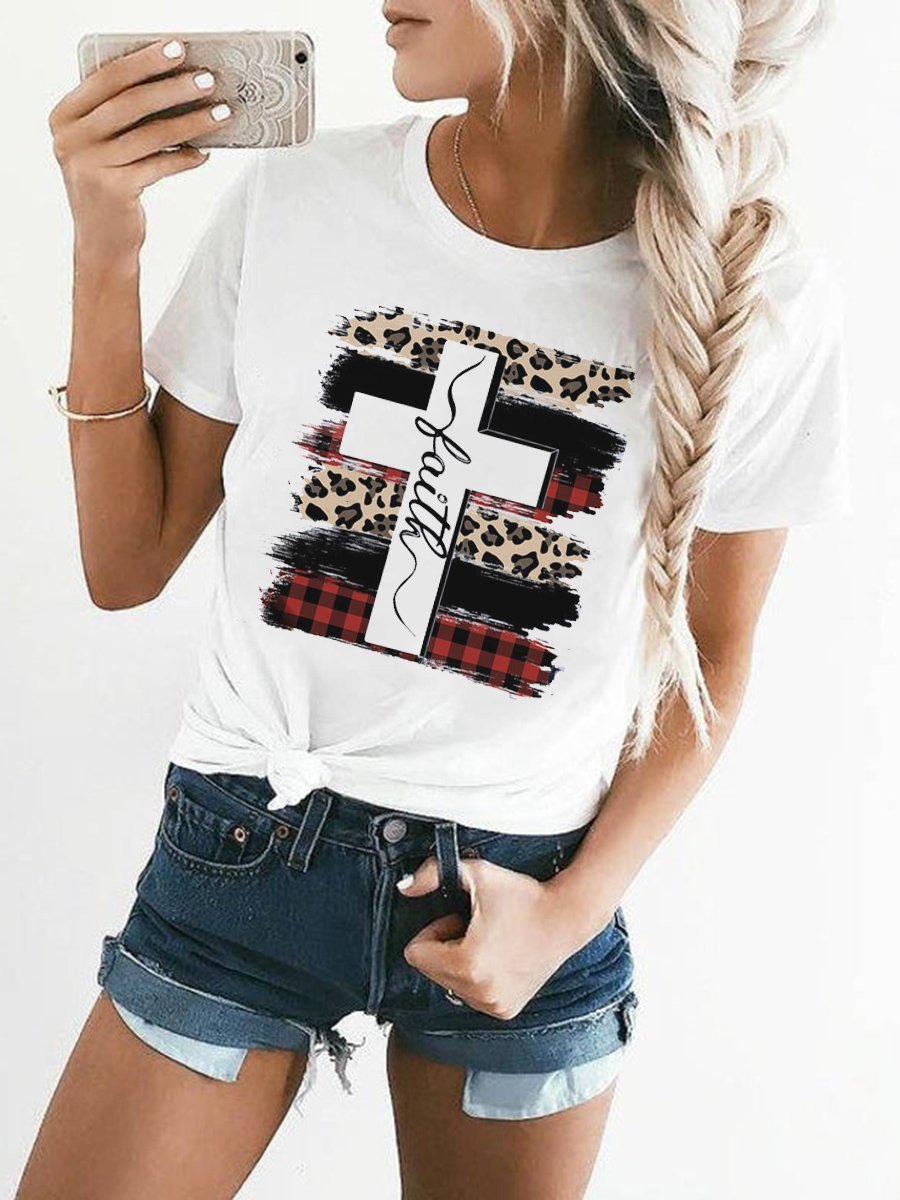 Faith Cross Plaid Leopard Printed T-Shirt
